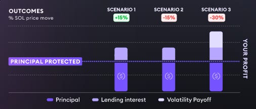 This means that only your interest yield has exposure to SOL - interestingly, this also opens additional yield opportunities - since you are opening a put, you can earn outsized returns from the put when the price of SOL drops by more than the price hedge (i.e. 25%). When the price of SOL falls below the strike price, the put option is in-the-money, and the Volt #5 depositor has the right to sell SOL at the strike price and earn a profit.